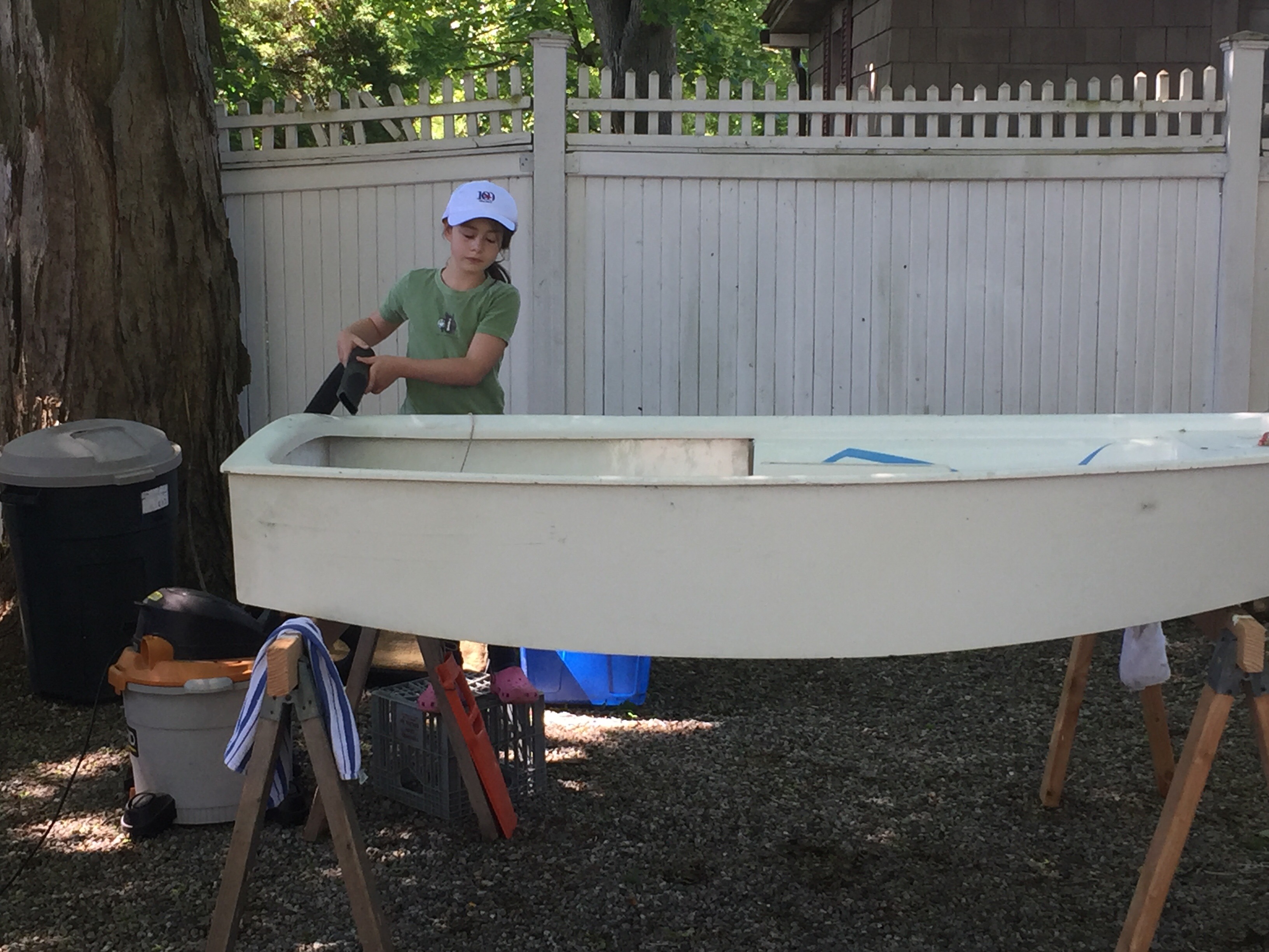 The proper care of a boat is definitely something she’s learning from me. Loblolly was a little rough, a tough little Winner (that’s the Dutch builder) who has had quite a variety of owners who made the most of her rugged construction. She’s the only one in the dock racks with varnished wooden daggerboard and rudder (all the others have composite, plastic rudders–where’s the fun in that?), and Zuzu says she sails just fine, and she would know since she was on the boat with a classmate–not an instructor–on just the third day. It was pretty windy and choppy. There were whitecaps.